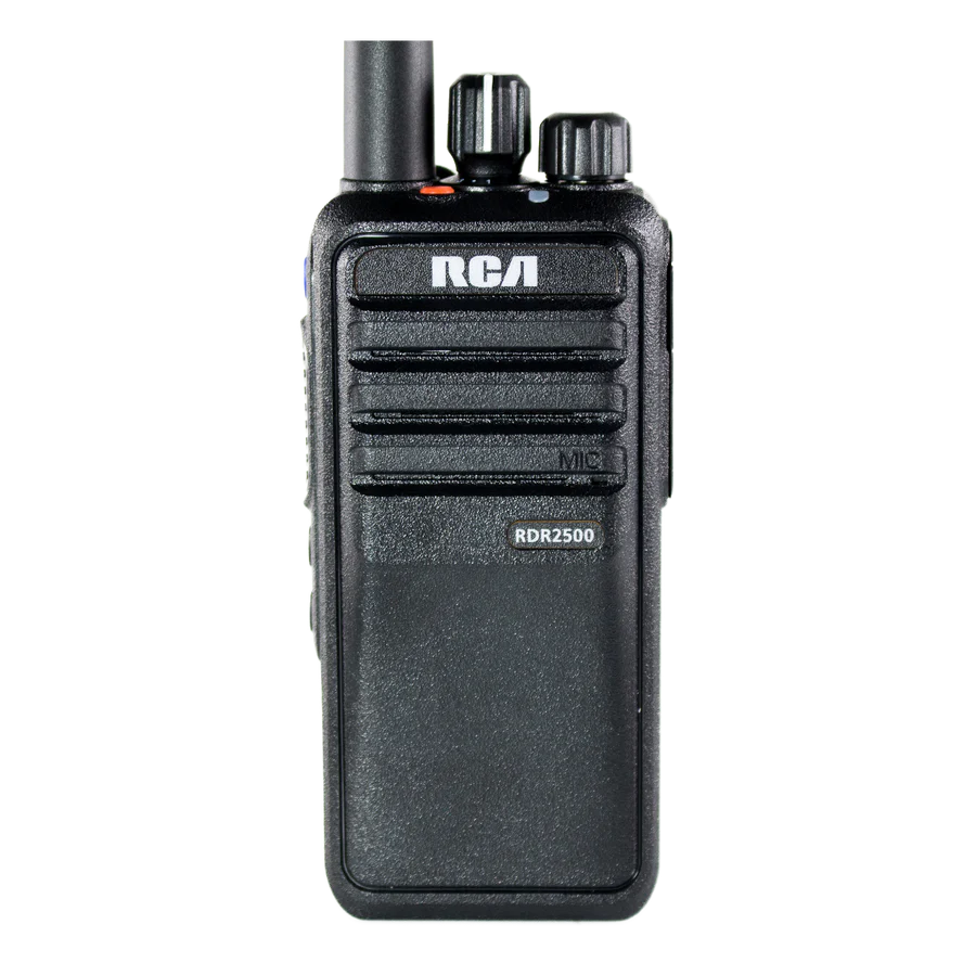 The RCA RDR2500 is a 32 channel handheld unit that is ideal for educational institutions, hospitality, manufacturing facilities and businesses. The RCR2500 transmits using analog or digital UHF or VHF frequencies, and can be programmed to work with other DMR capable digital radios (Motorola, Hytera, etc) in digital mode and most radio brands when operating in analog mode.