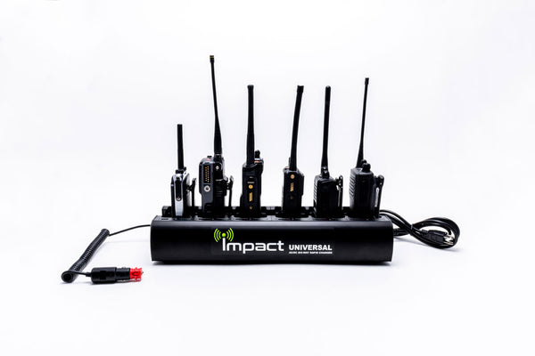 Charge six different batteries with or without the radio attached! This premium universal rapid two-way radio battery charger with USB device support is made of polycarbonate plastic for strength and durability. Space-saving design with dual internal (not in-line) power source allows you to charge your radios anywhere.